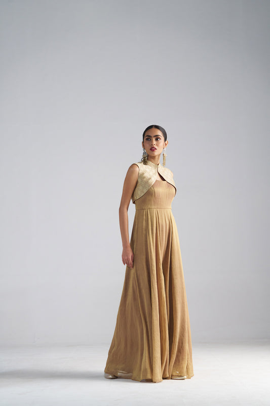 Golden Tissue Jumpsuit with Brocade Shrug