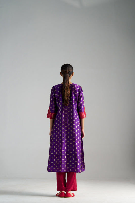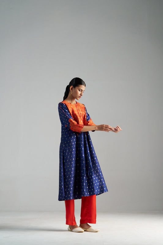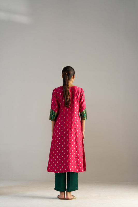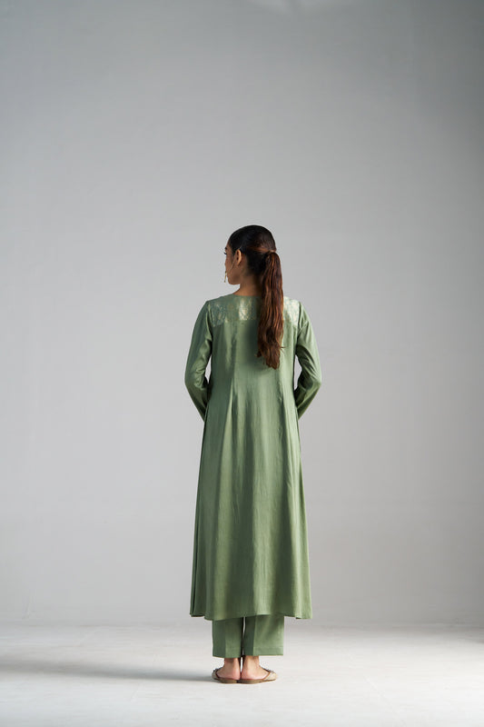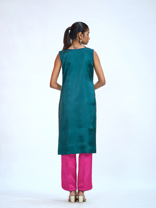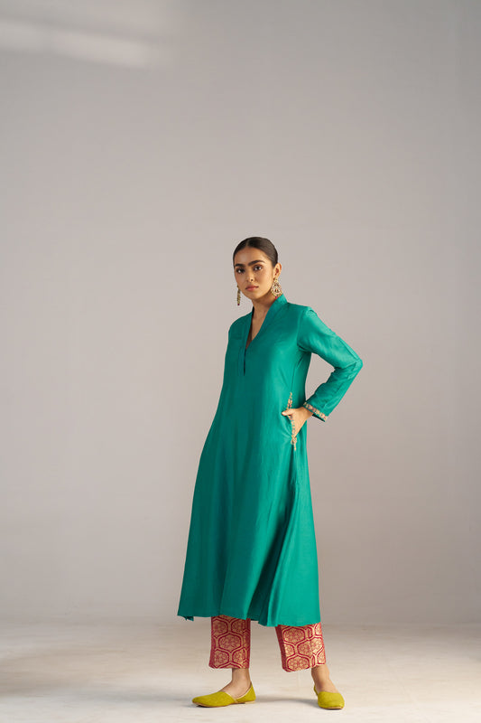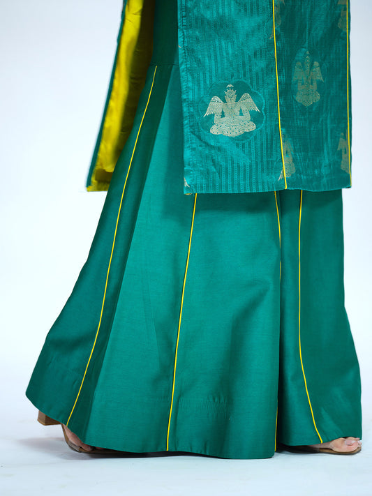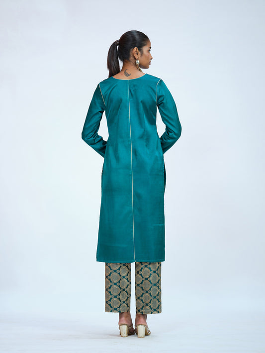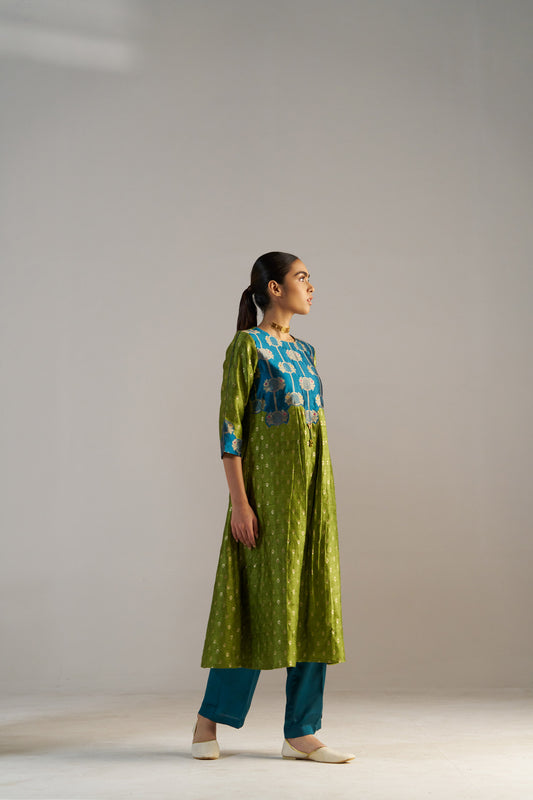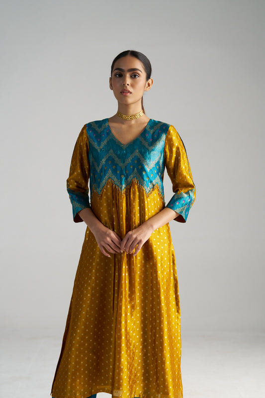 Teal Blue And Yellow Brocade A-line Kurta Set