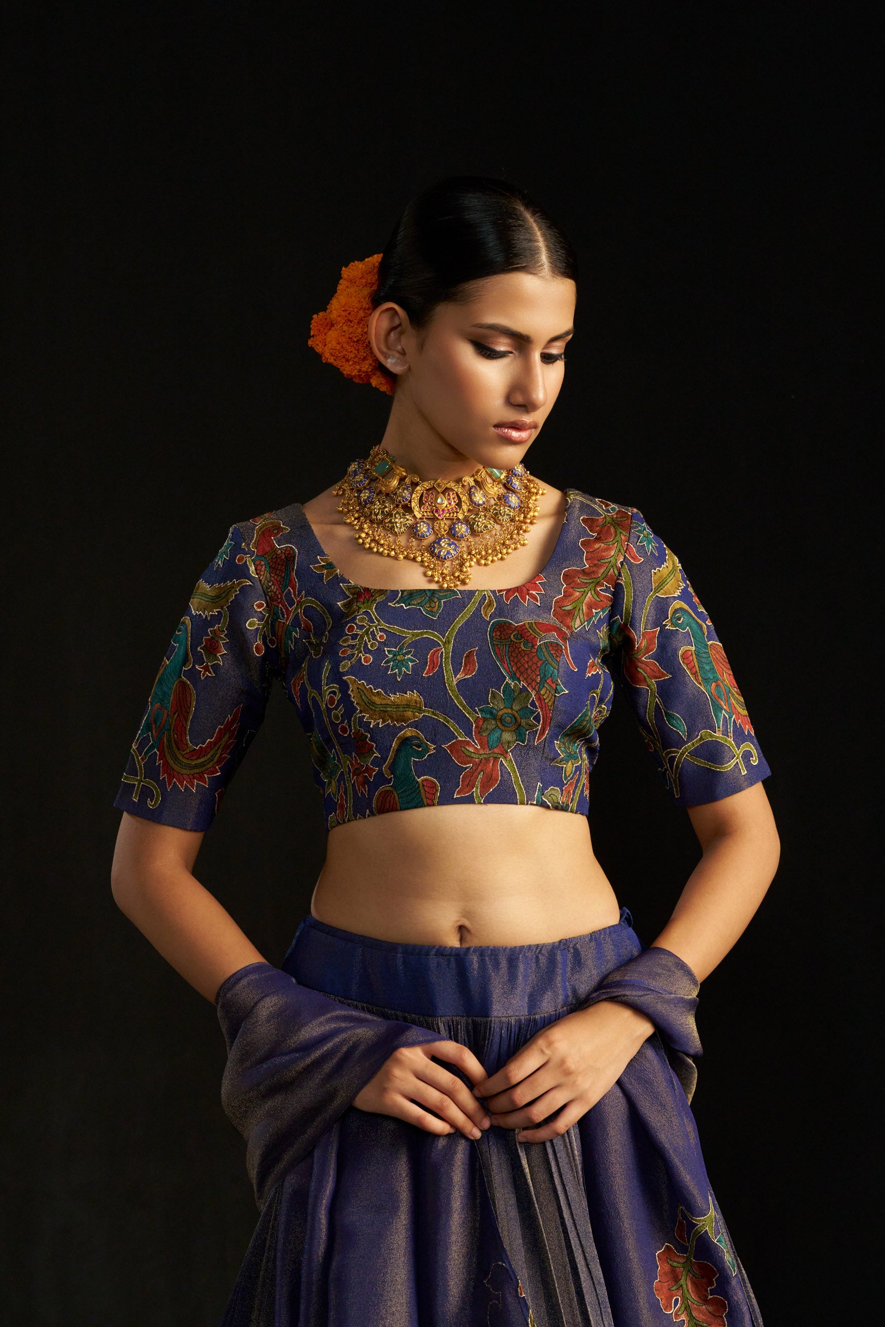 Dark Blue Kalamkari Lehengha , Blouse And Dupatta