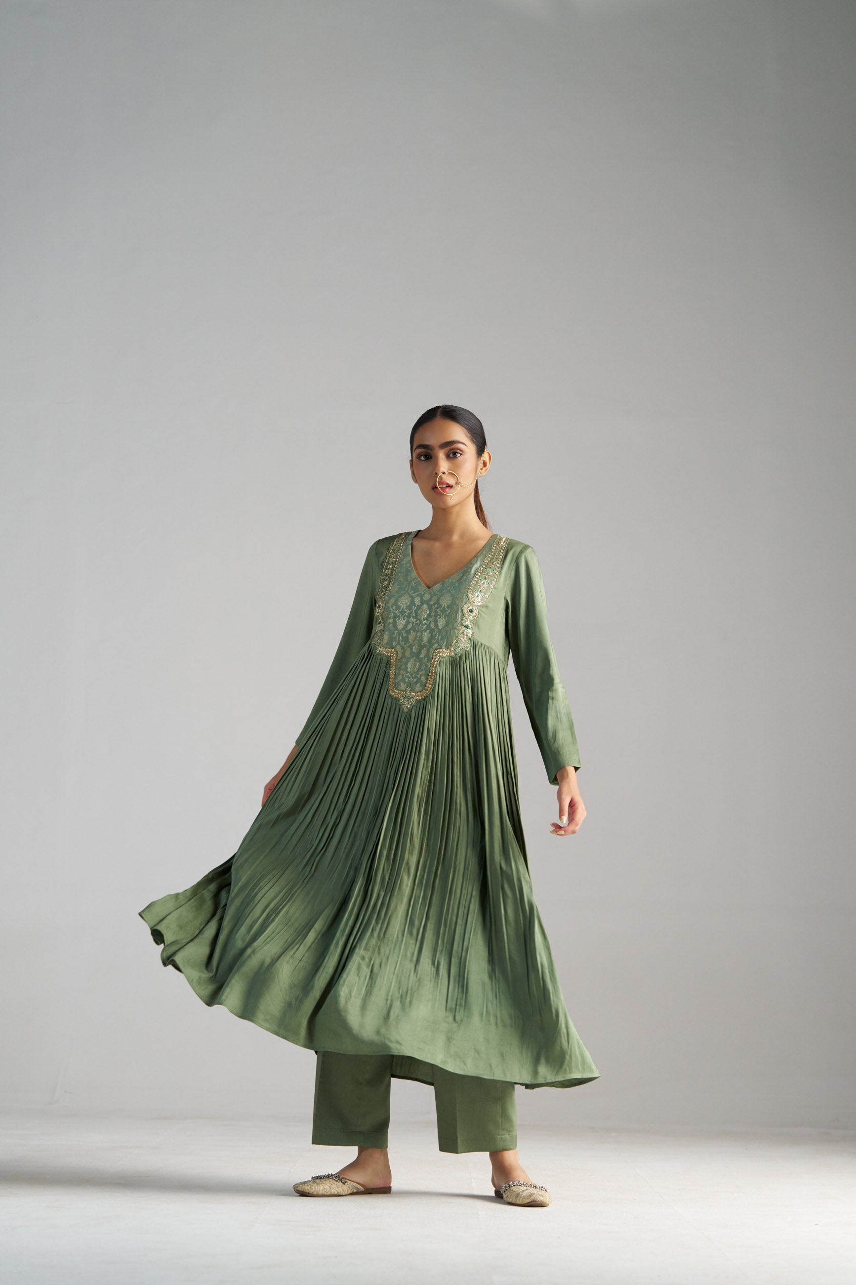 This green pleated kurta features full sleeves, a round neckline, and a beautiful interplay of brocade fabric and hand-embroidered accents. It is paired with comfortable straight pants with an elasticated back, an easy, elegant festive choice.