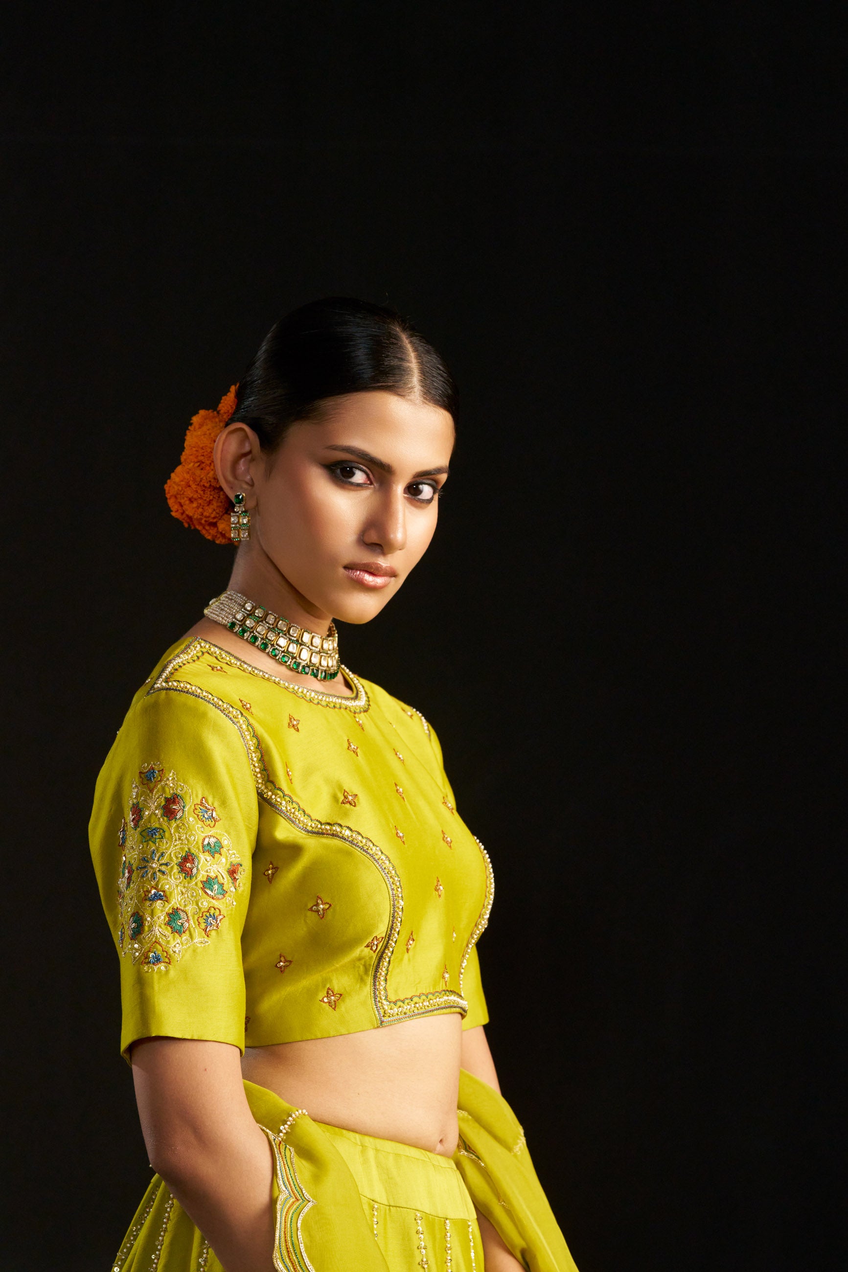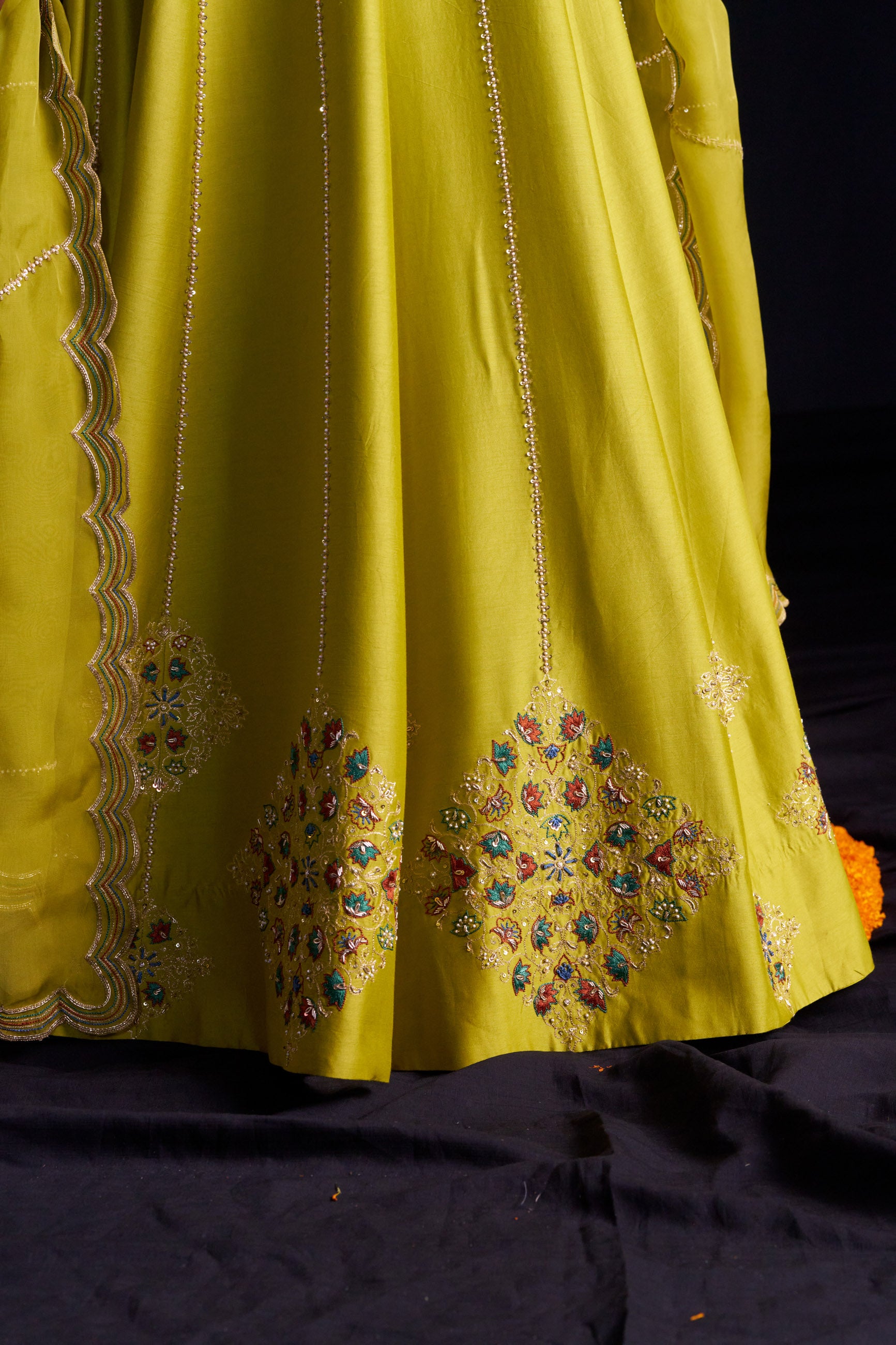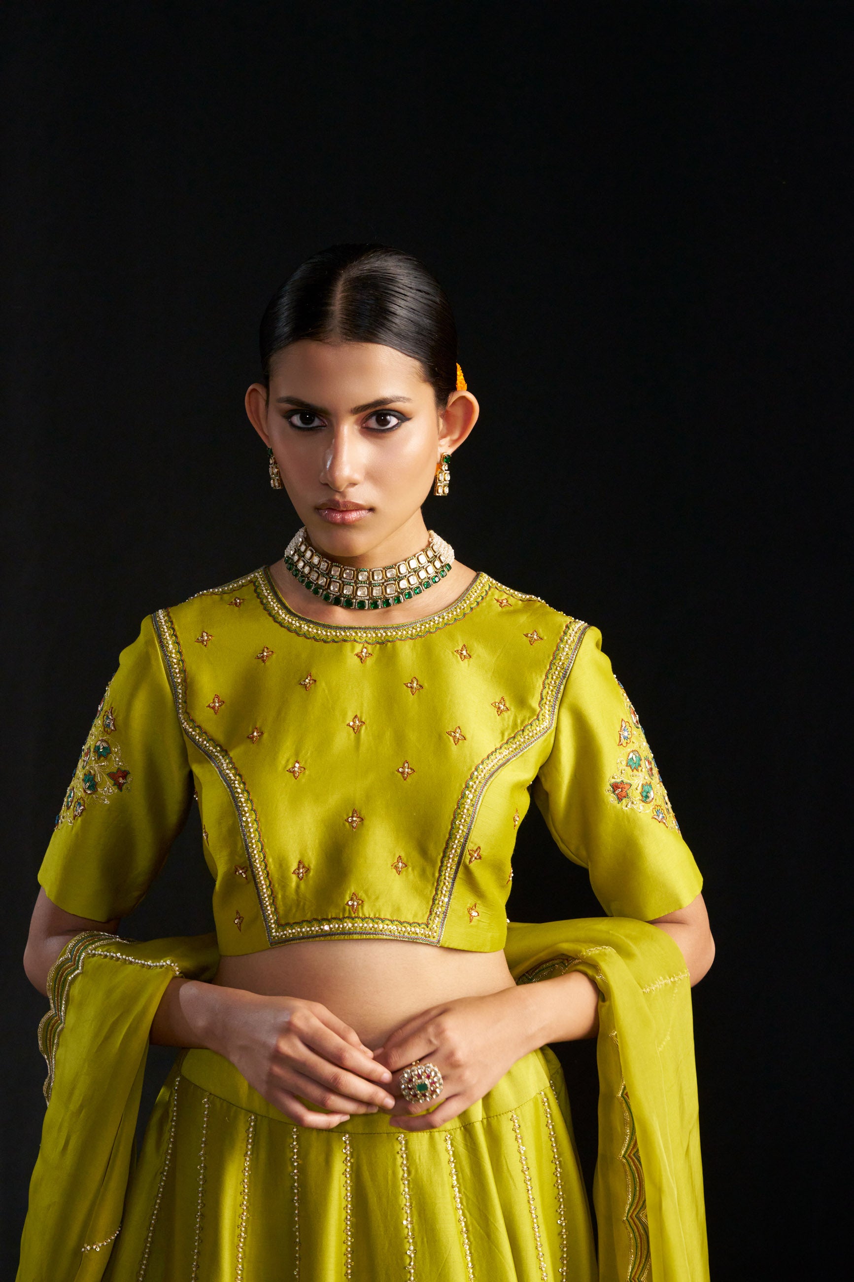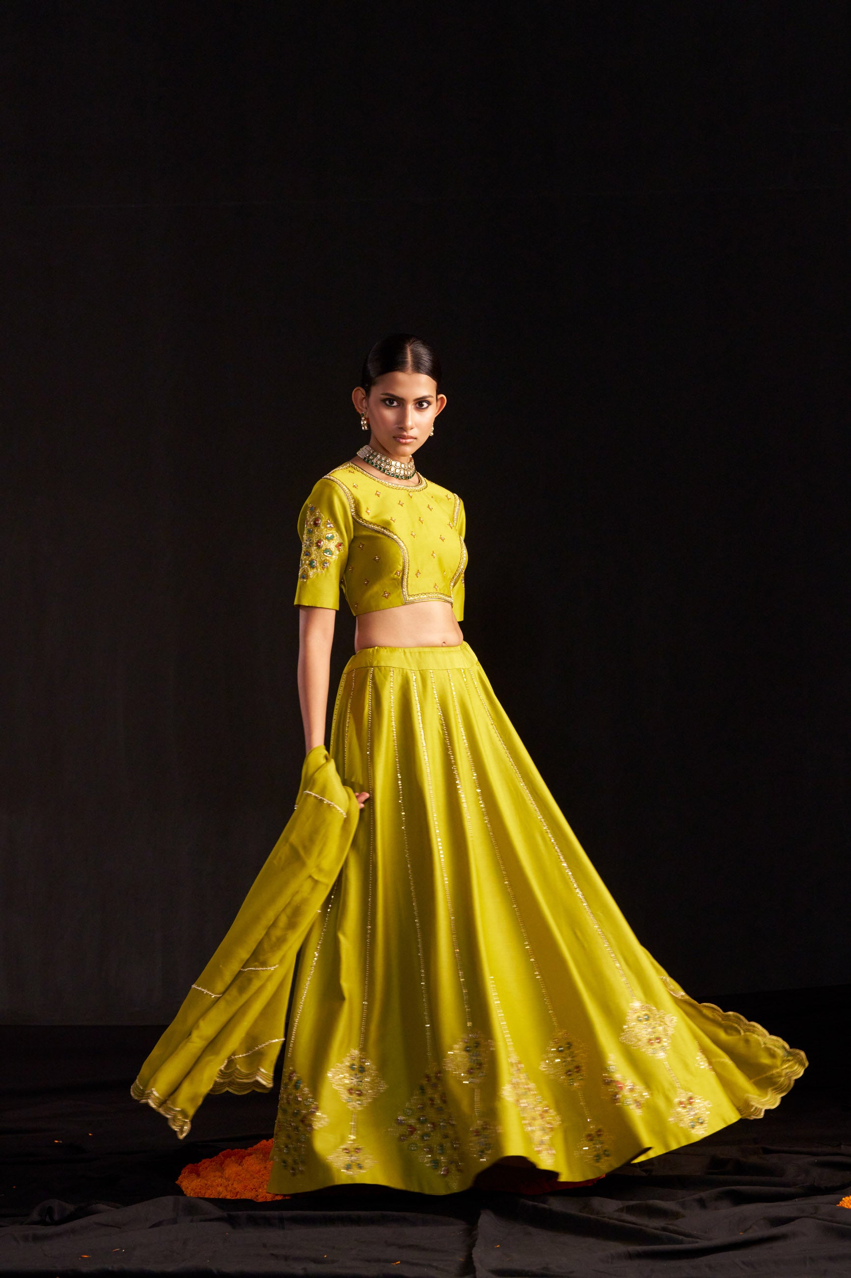 Elegant and festive, this green silk lehenga set features a hand-embroidered blouse, kali ghera lehenga with an adjustable inner tie, and a scalloped organza silk dupatta. The blouse is elbow-sleeved, padded, and secured with back hooks.
