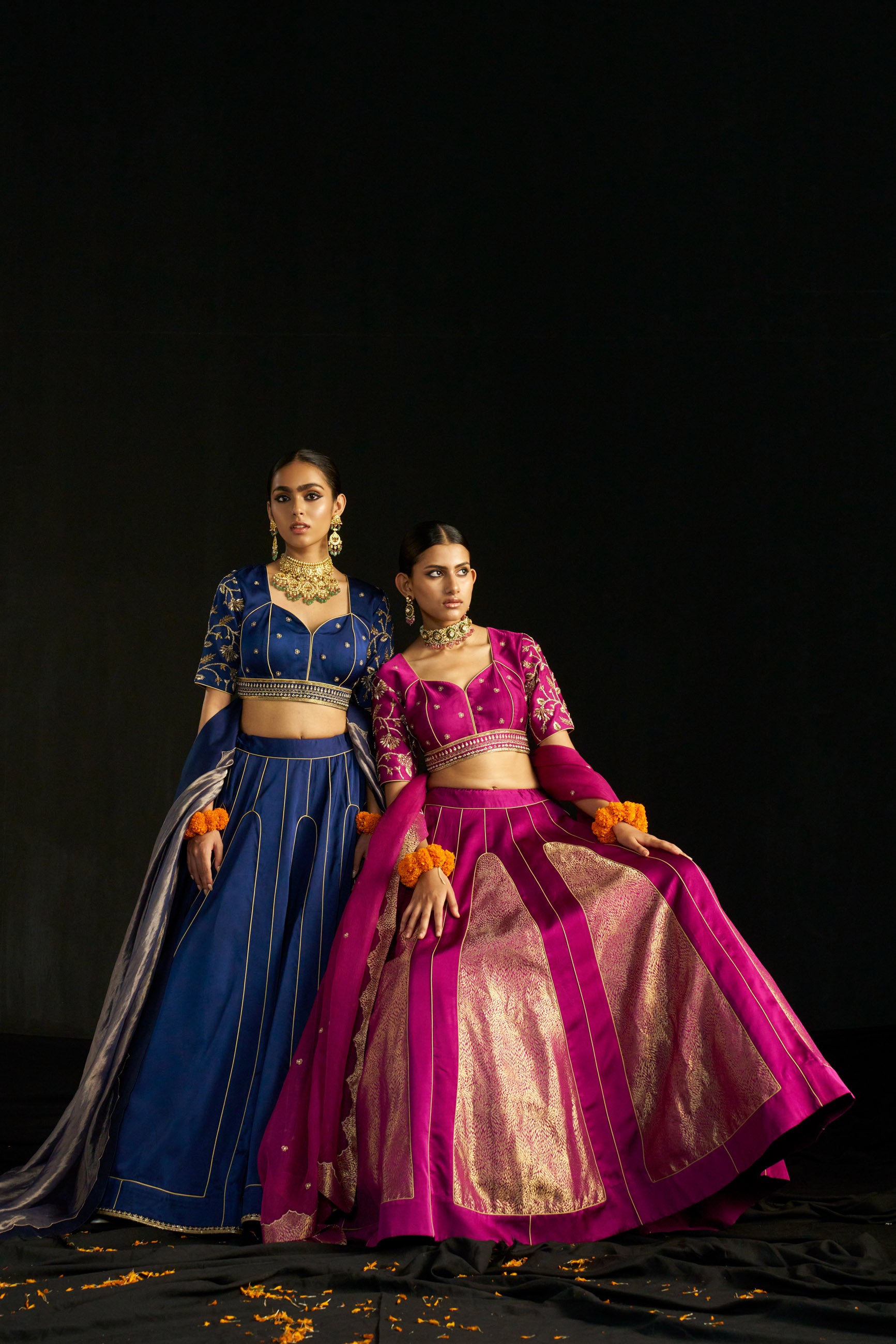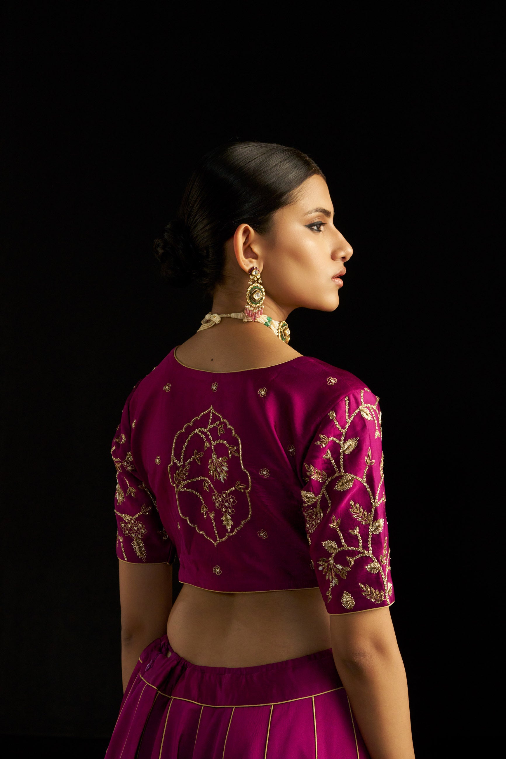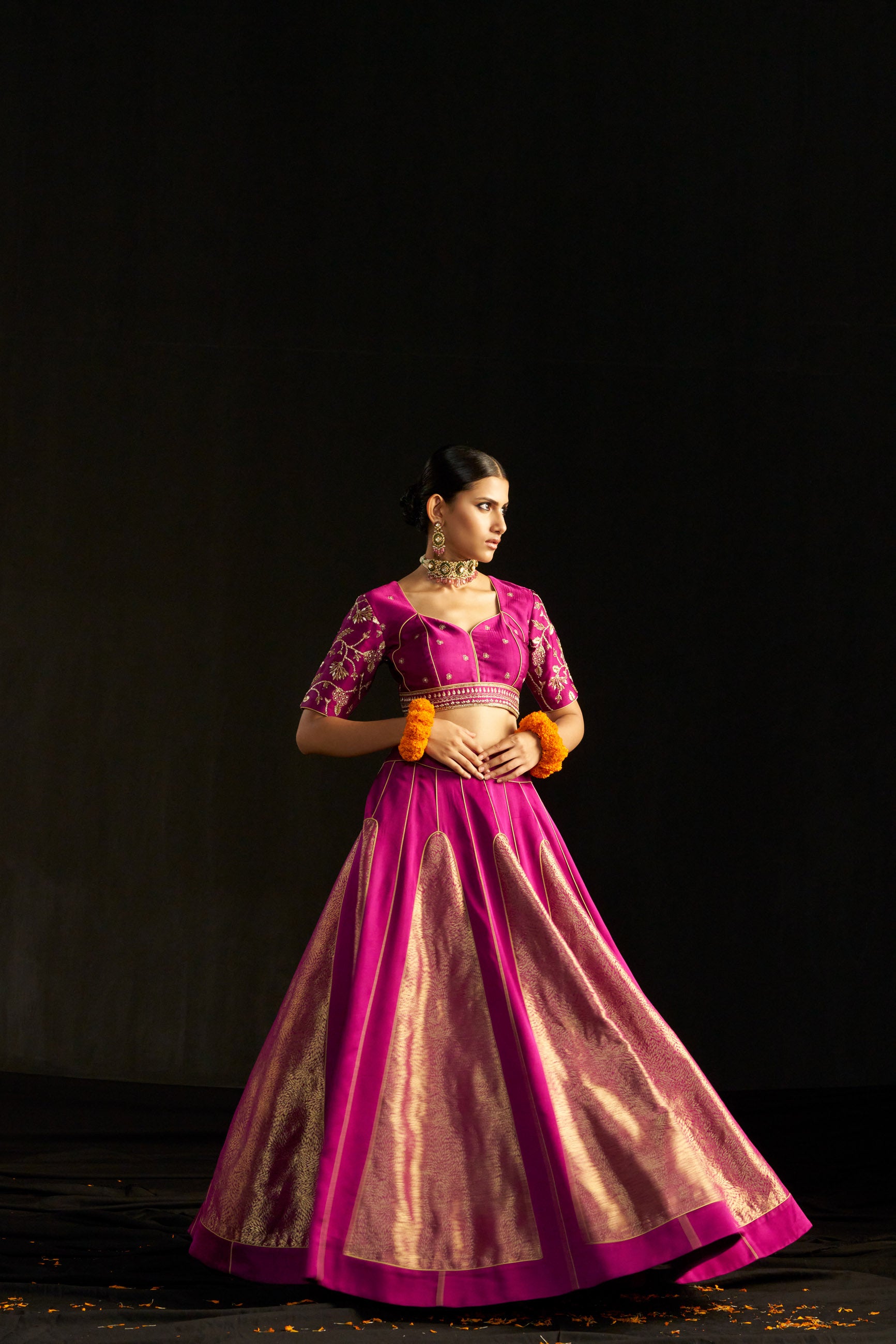 This magenta brocade lehenga set showcases royal patterns and hand-embroidered accents on the silk blouse. The kali ghera lehenga has an adjustable inner string, while the blouse has padded elbow sleeves and back hooks. An organza dupatta with brocade details adds grandeur.