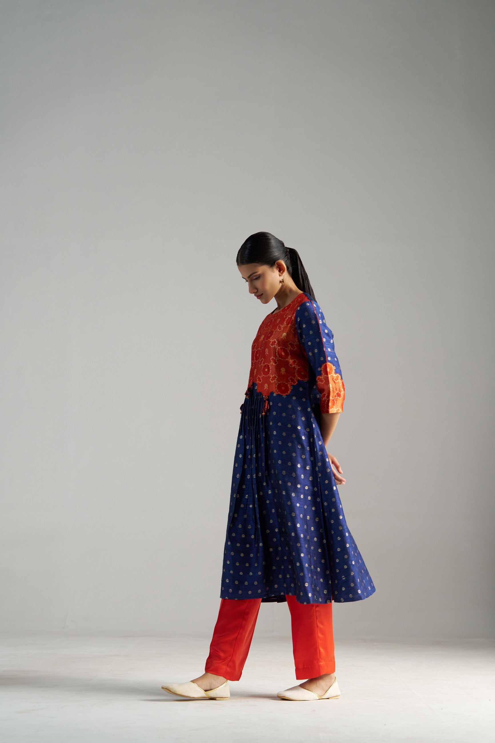 A bold blend of orange and blue in this brocade kurta, styled with 3/4th sleeves, a round neck, and side slits. Completed with matching straight-fit pants featuring an elasticated back for comfort.