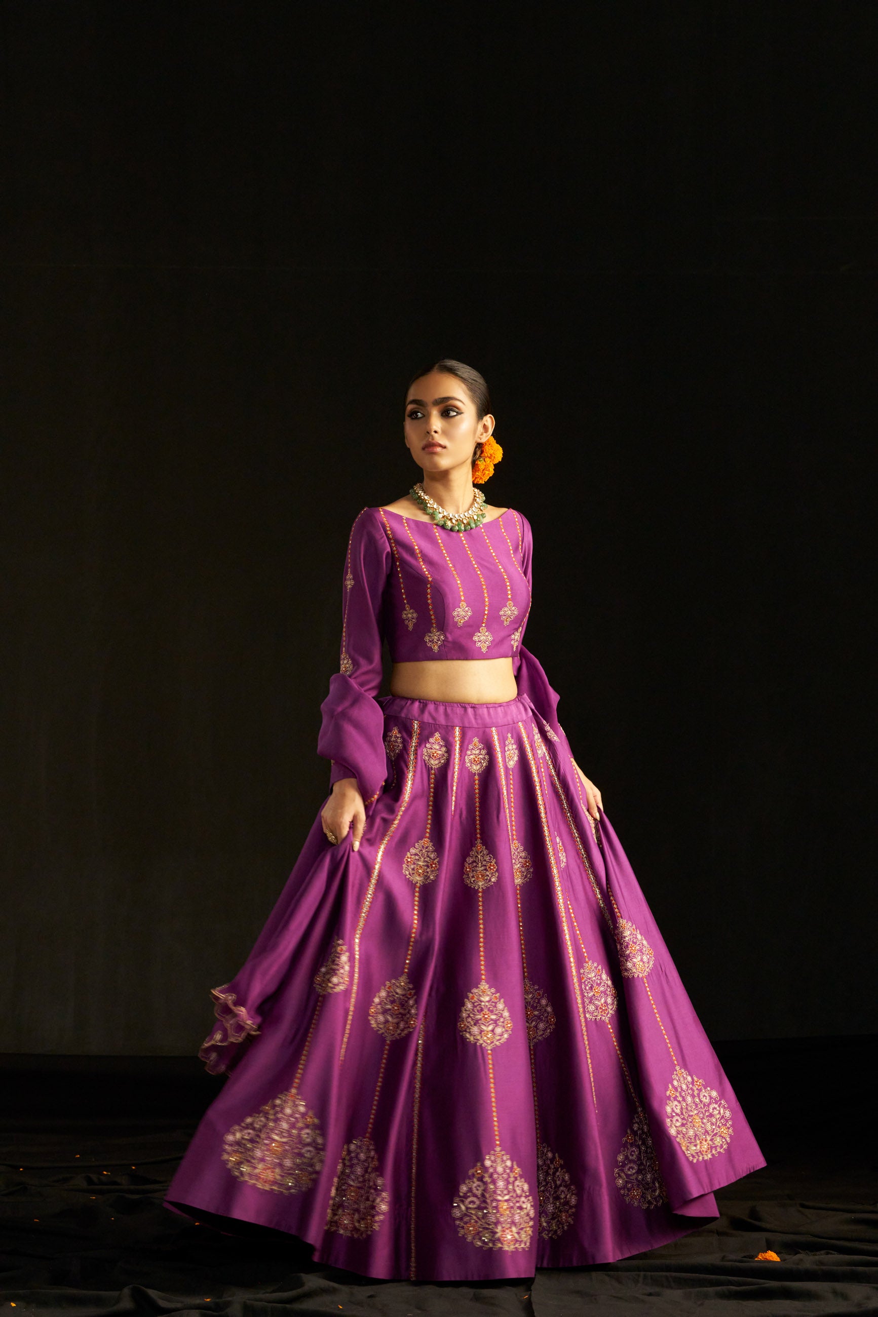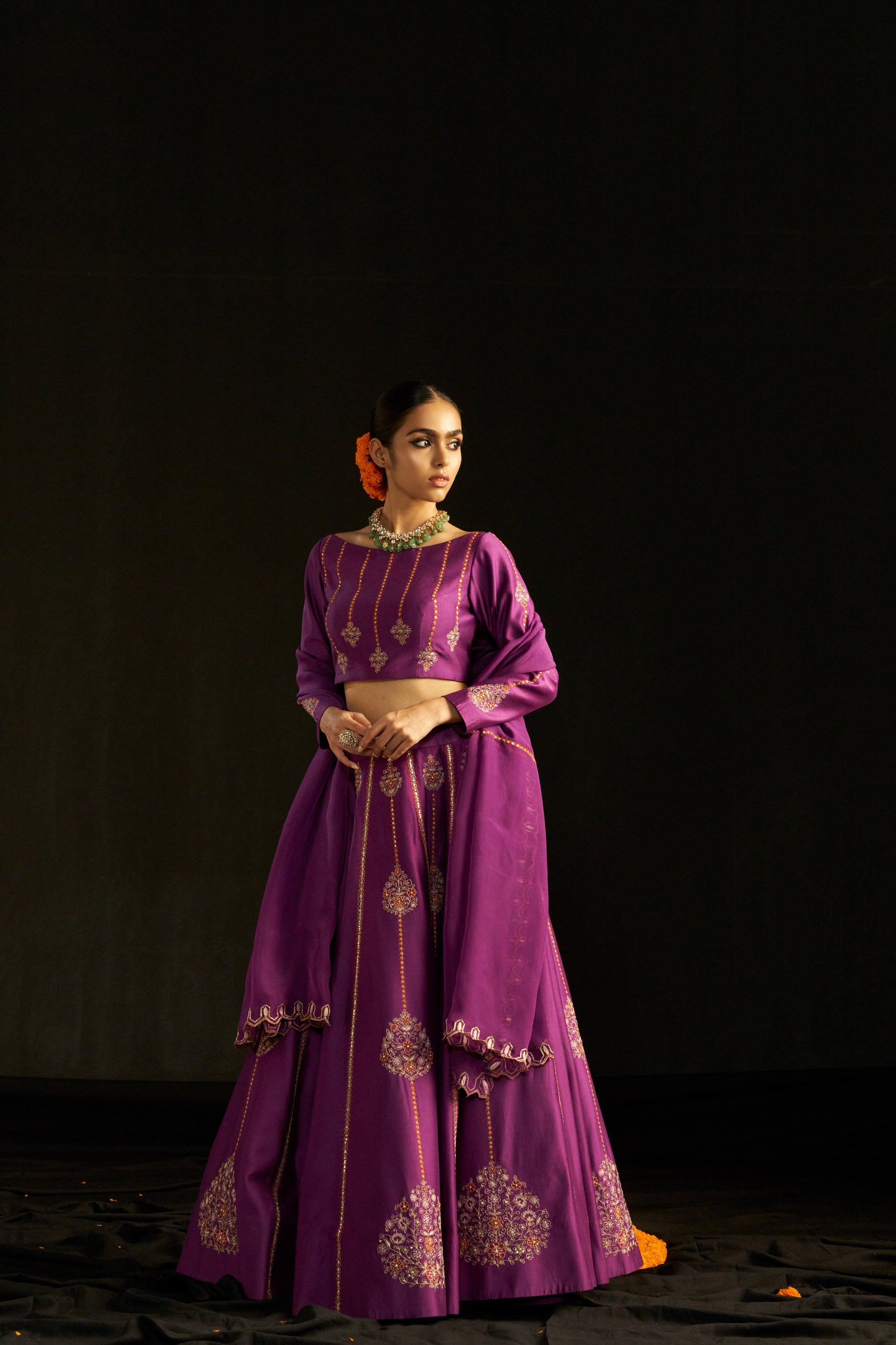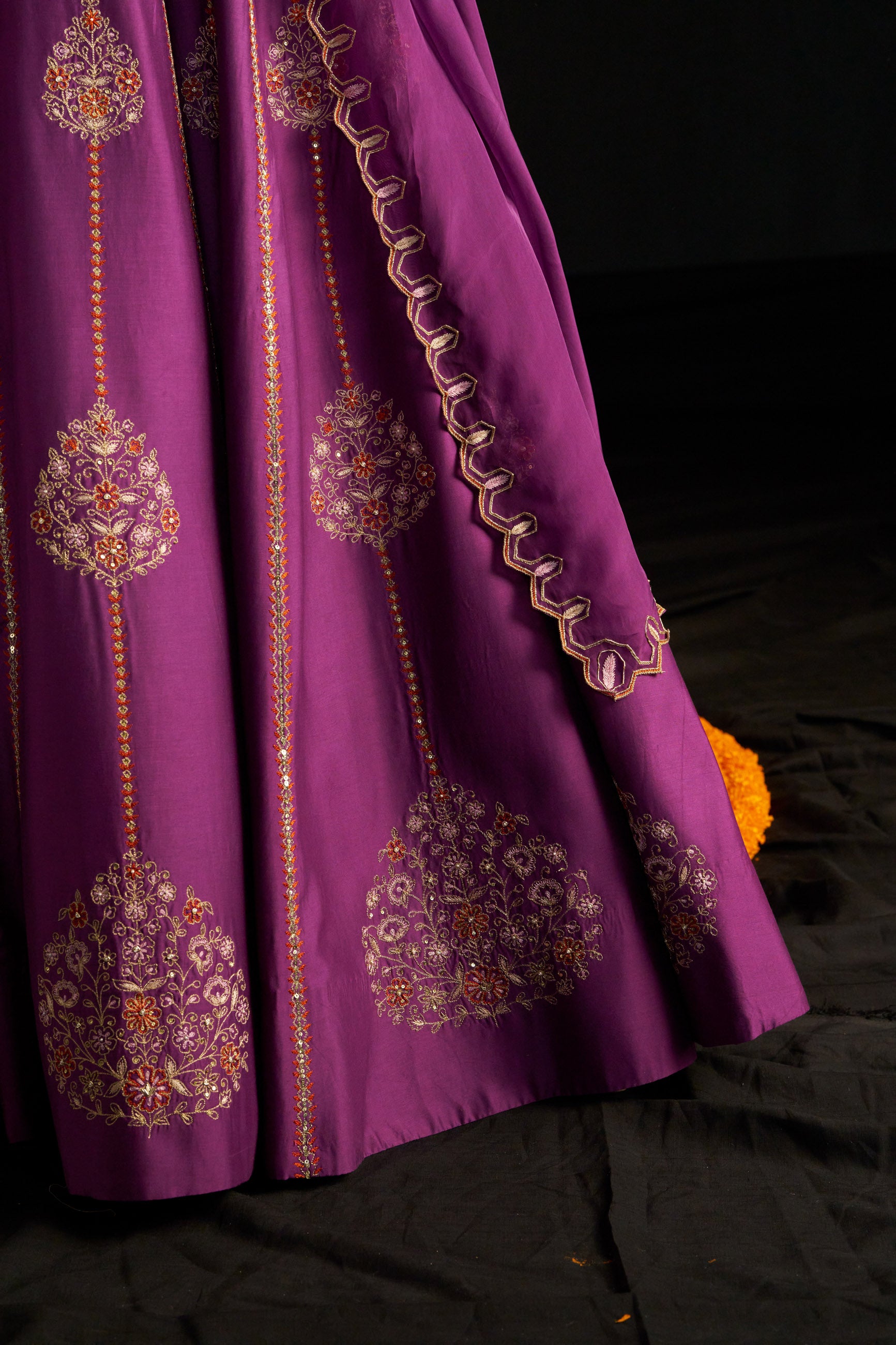 A rich purple silk lehenga set with intricate hand-embroidered details across the blouse, skirt, and dupatta. The kali ghera lehenga has an adjustable waist tie, and the full-sleeve blouse is padded with back hooks. The organza dupatta is scalloped and sheer for a refined finish.