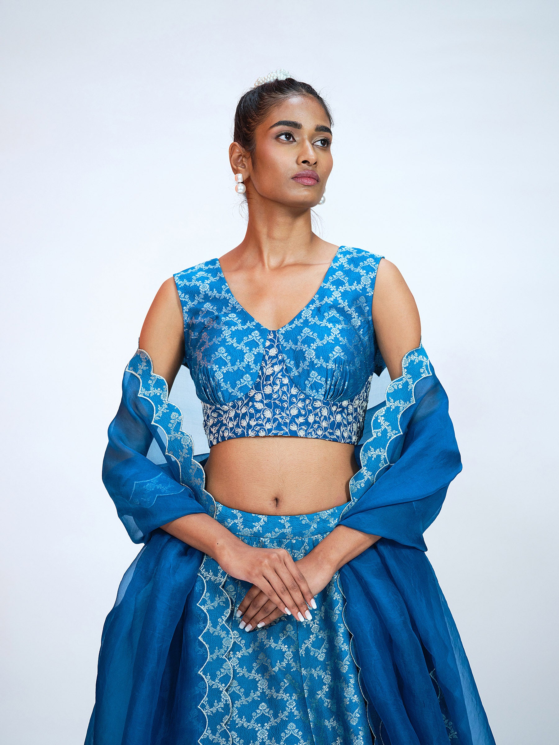 Brocade Lehenga, brocade blouse with hand embroidered details and organza dupatta with brocade border