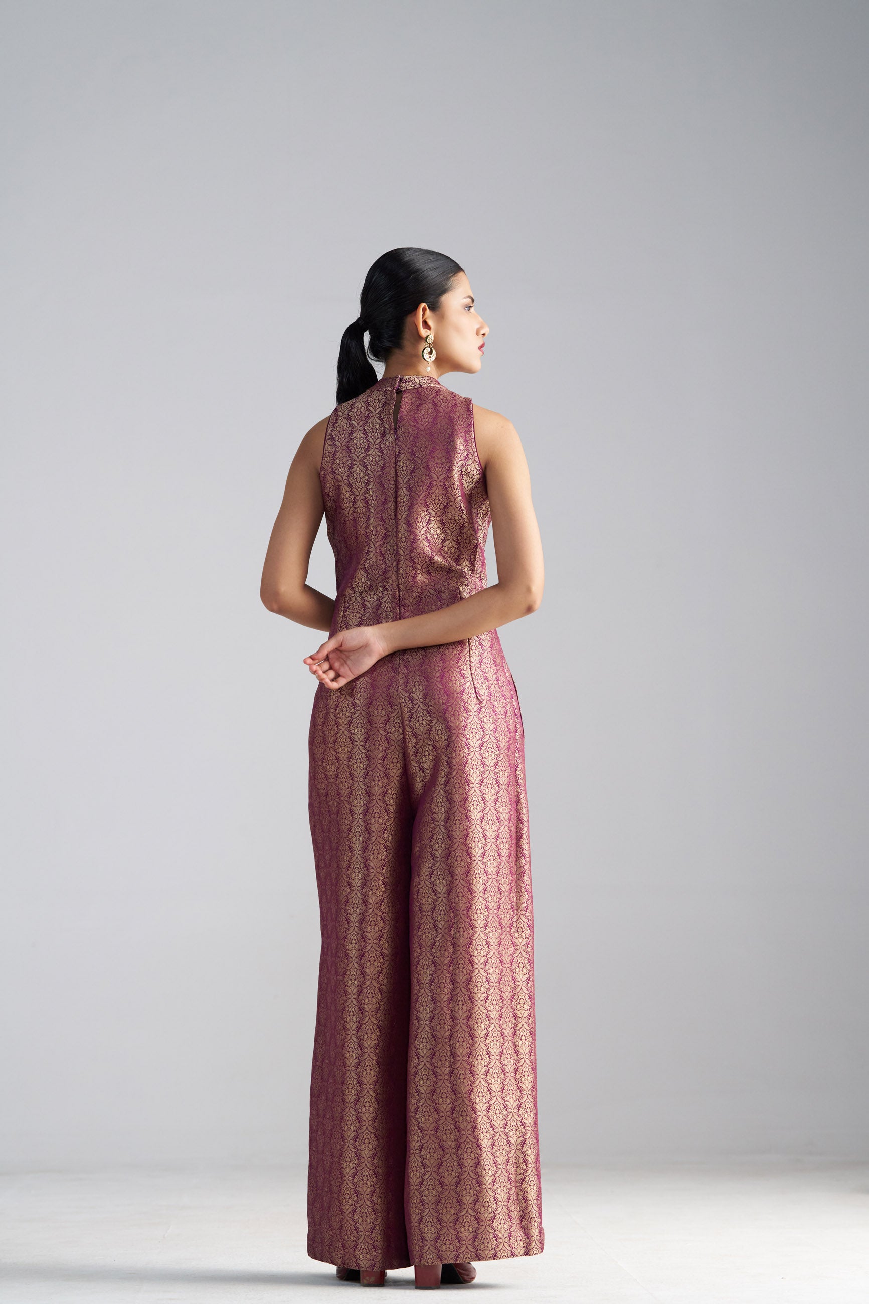 Easy and elegant, this wine brocade jumpsuit comes with a sleeveless cut, polo neckline, back zip closure, and handy side pockets. A perfect pick for festive get-togethers.